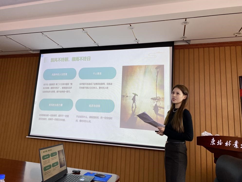 活动伊始,学校办公室党支部党员赵怡、孙增林分别以《老子·道经·第二十三章》名句“飘风不终朝,骤雨不终日”为主题进行了主旨演讲,他们结合各自工作经历和人生阅历,分享了对这句话的理解与感悟。学校办公室、发展规划处班子成员分别对演讲进行了点评,指出演讲语言优美、富有哲理、发人深省,置身富有“学参天地、德合自然”底蕴的东林校园,恰恰也是老子道家思想的传承和延续,勉励与会同志在工作生活中尊重并顺应客观规律,弘扬践行东林精神,坚定信念、保持热情、不懈奋斗,不断向成功的彼岸迈进。